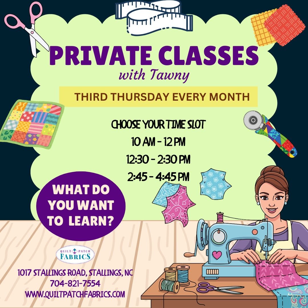 Private classes are held on the first Thursday of every month. Choose your timeslot (10 AM, 12:30 PM, or 2:45 PM). Once you have registered and paid for the class, you must contact Tawny directly to discuss the details of your class so that she can be sure to be prepared for you! Contact Tawny via email at textilesbytawny@yahoo.com